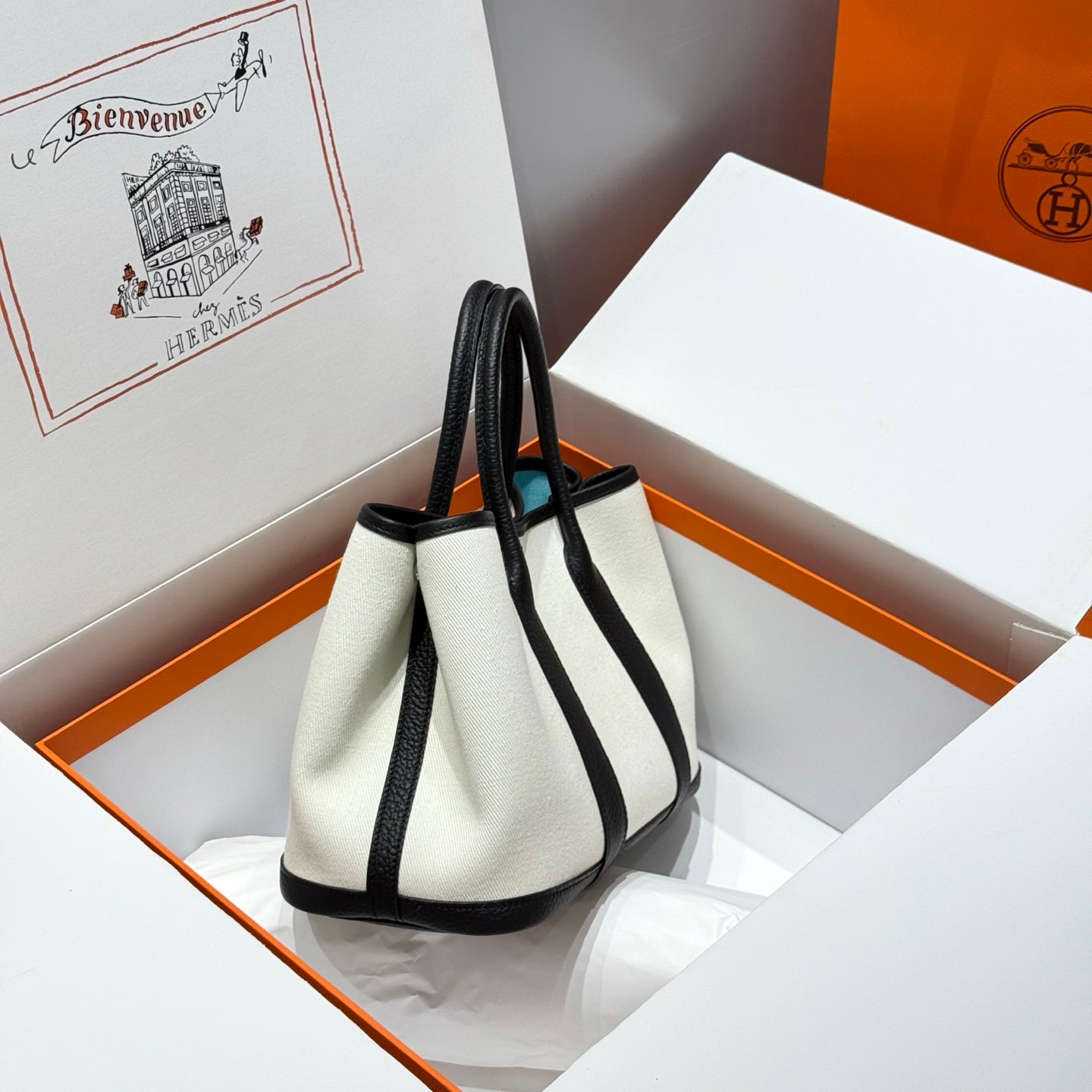 GARDEN PARTY 30CM IN WHITE TOILETS COTTON CANVAS AND BLACK CALFSKIN SKY BLUE CANVAS ON SIDE OTHER